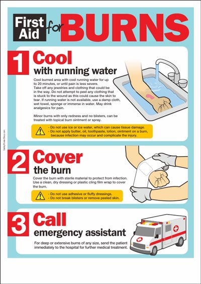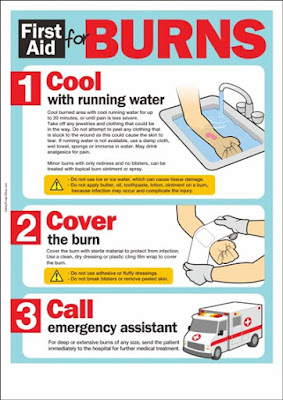 Now if you have burns (especially second and third degrees) just apply cold/cool running water and cover it with a cling film. Never put ointments or any substance on them (even if it was a first degree burn covering large areas). It is important to remember that these sort of burns require immediate medical intervention.
